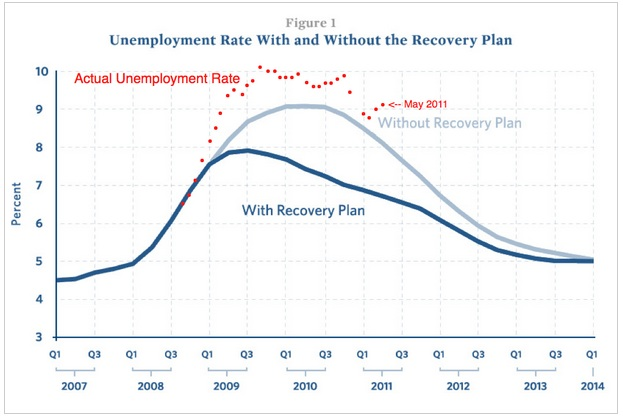 The Obama administration initially projected that passing the controversial $800 billion stimulus package would bring unemployment below 6 percent by the end of the president’s first term.