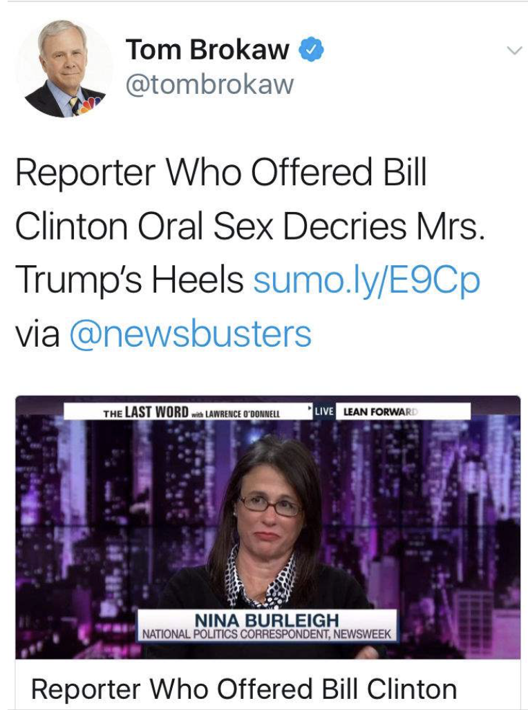 Burleigh said in 1998 that she would give Bill Clinton oral sex in thanks for keeping abortion legal, and NewsBusters' headline read, "Journalist Who Offered Bill Clinton Oral Sex Decries Mrs. Trump's Degrading High Heels."