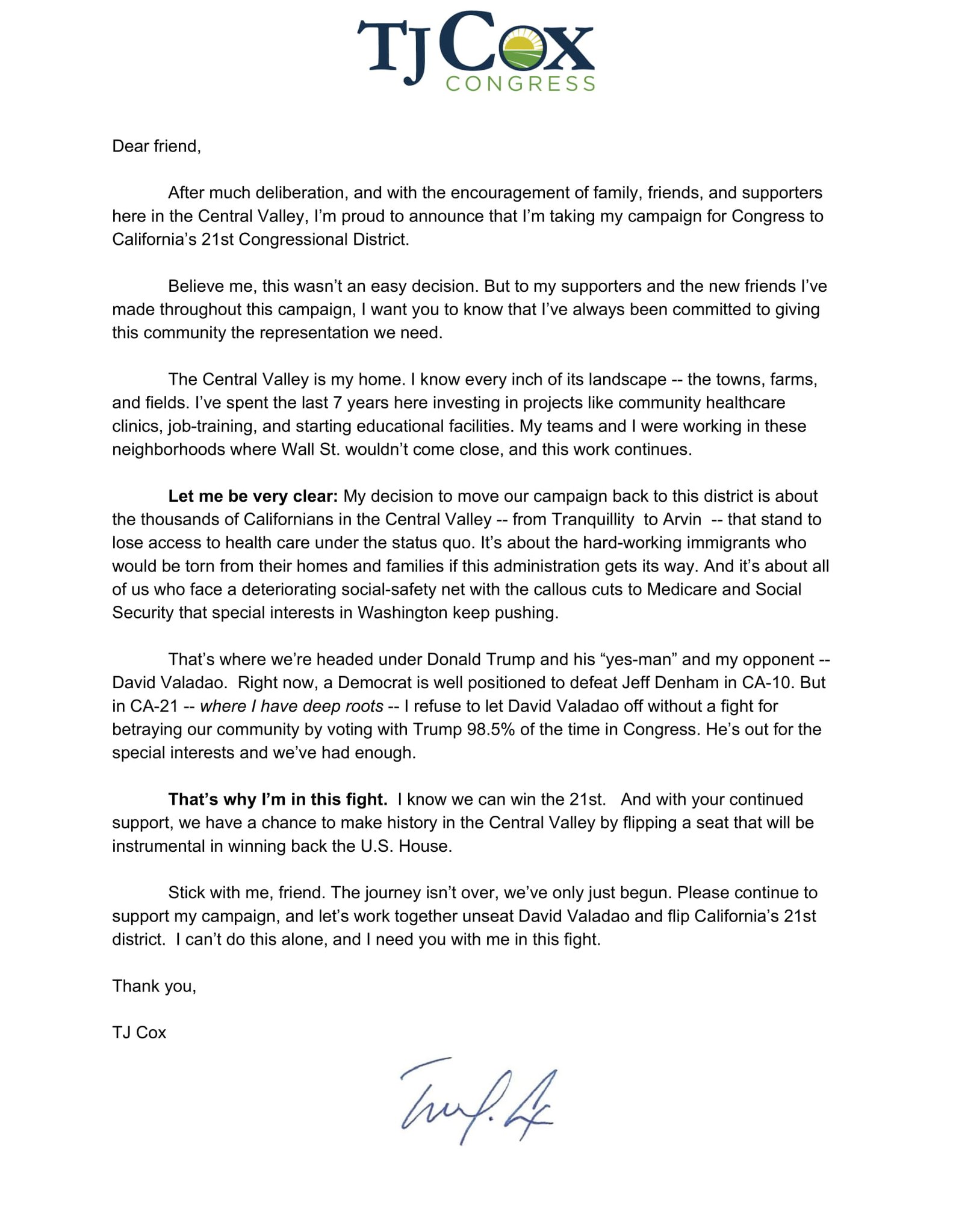 "Let me be very clear: My decision to move our campaign back to this district is about the thousands of Californians in the Central valley -- from Tranquility to Arvin -- that stand to lose access to health care under the status quo," Cox wrote.