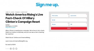 The page read "Sign Me Up" at the top and was titled, "Watch America Rising's Live Fact-Check Of Hillary Clinton's Campaign Reset." It featured the URLS of America Rising's Twitter page and official site, which has a litany of anti-Hillary Clinton ads on its front page.