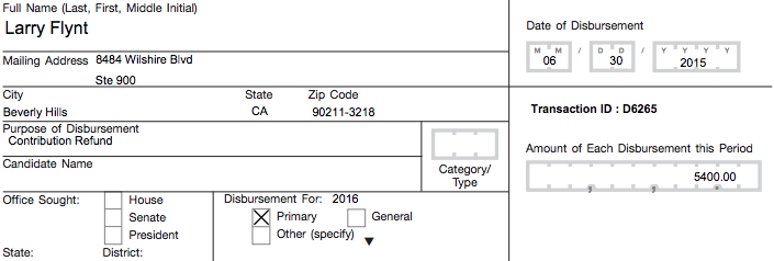Flynt, who grew famous through Hustler magazine, made two contributions worth $2,700 to the Clinton campaign during the month of June. Later in the month, both contributions were returned.