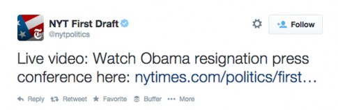 The New York Times First Draft Twitter account invited people to watch the "Obama resignation" on their website.