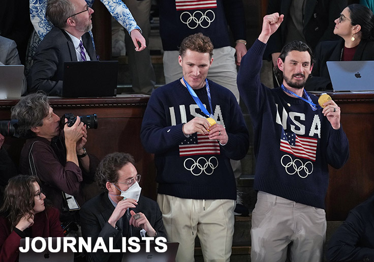 The male hockey stars strolled into the gallery wearing their medals and basked in the enthusiastic chants of "USA!" The nearby press corps looked on in silence, but even some Democrats joined half-heartedly. "That's the first time I've ever seen them get up," Trump quipped before also praising the USA women's hockey team for winning Olympic gold. That got almost every Democrat on their feet. At least they could agree on something.
