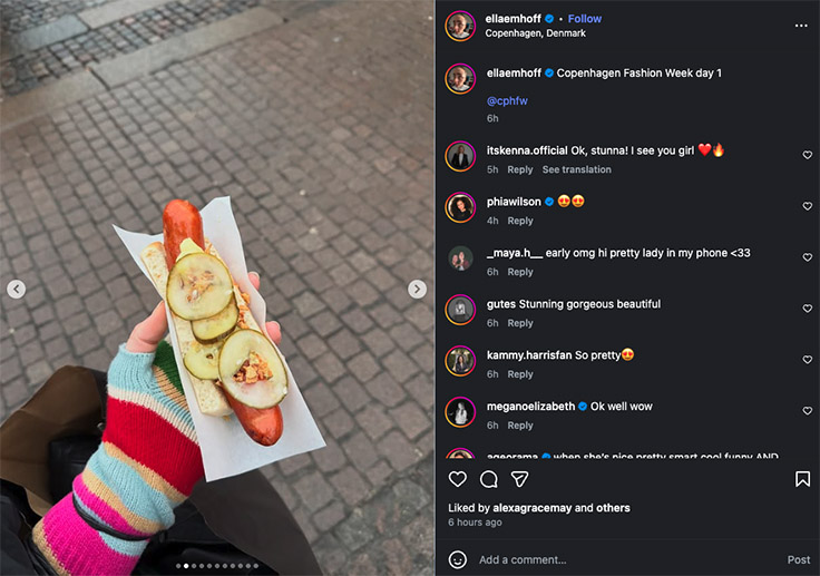 Nevertheless, Emhoff persisted. Mere hours after promoting the edgy apparel, she authored a second Instagram post that included photos of her enjoying the fashion week festivities and getting ready to chow down on a tasty Danish hot dog from one of the city's legendary pølsevogne, or "sausage wagons."