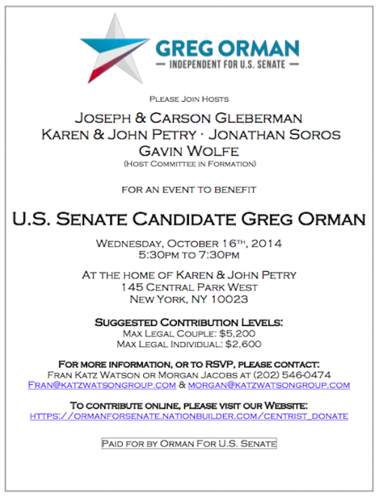 Jonathan Soros, son of billionaire Democratic donor George Soros, will host a New York City fundraiser this week for Orman, who is running as an independent candidate, according to an invitation obtained by America Rising.