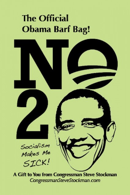 Rep. Stockman (R., Texas) promises to send donors one barf bag for every $10 they donate. The paper vomit receptacles prominently feature President Barack Obama’s face, with "NO 2" next to it.