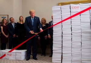 While making the announcement, Trump stood beside a mountain of paperwork that makes up the Federal Register. A piece of red tape connected a much smaller pile, which represented the regulatory code in 1960.