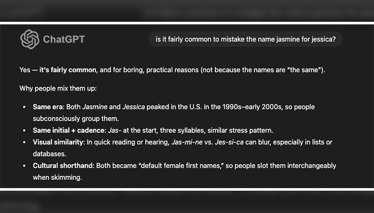 According to Google, the popular online search engine, a woman named J. Crockett was charged with assault after kicking a police officer in the face while resisting arrest in 2022. Local news reports identified the perpetrator as "Jessica Crockett," but also referred to her as "Crocket," suggesting the woman's first name might be slightly misspelled as well. According to ChatGPT, it is "fairly common" to mix up the names Jasmine and Jessica given their visual and phonetic similarity.