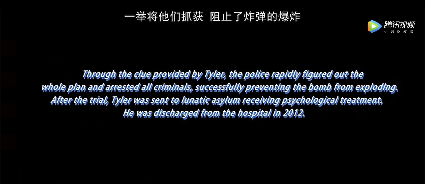 Through the clue provided by Tyler, the police rapidly figured out the whole plan and arrested all criminals, successfully preventing the bomb from exploding. After the trial, Tyler was sent to lunatic asylum receiving psychological treatment. He was discharged from the hospital in 2012.