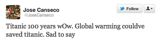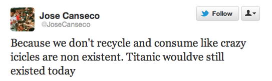 In a series of tweets over the weekend, Jose Canseco argued that had global warming existed 100 years ago, it could have saved the Titanic. "Because we don't recycle and consume like crazy," the former baseball player said, "icicles are non existent [sic]."